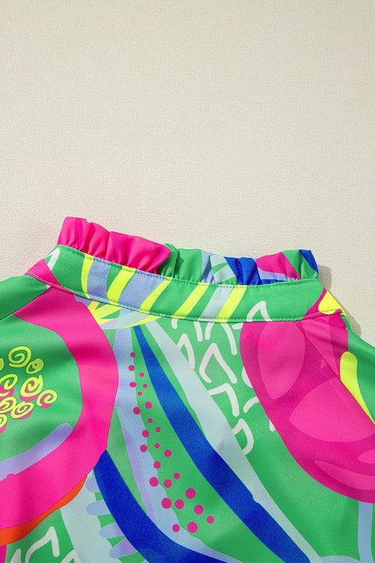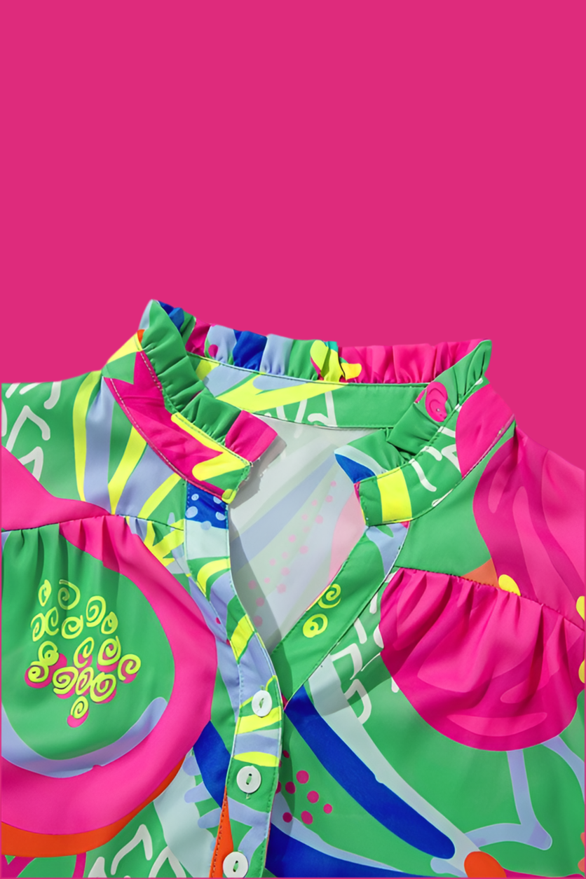 Abstract Ruffled Sleeve Buttoned V Neck Blouse